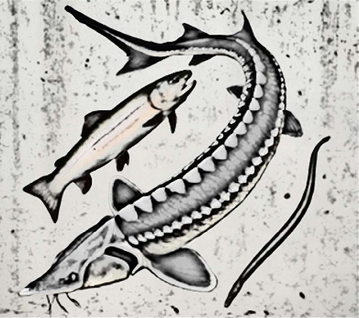 Cover art of a stylized salmonid, sturgeon, and lamprey generated by Joe Skalicky using Google Gemini, 2024.