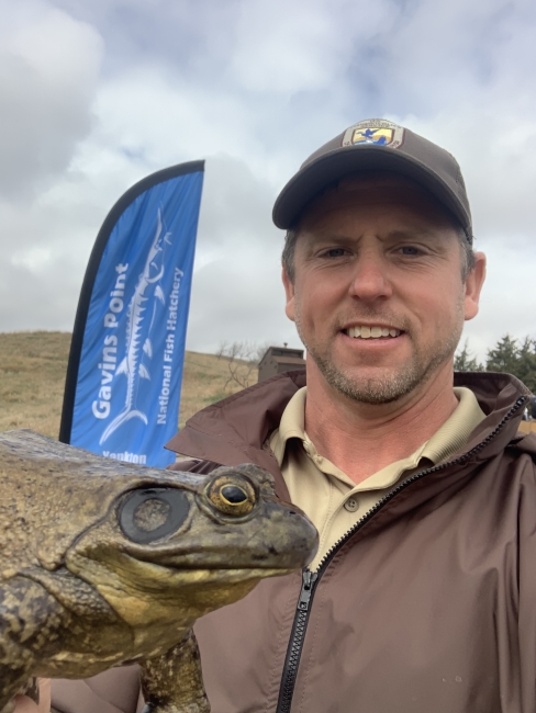 Sam Stukel holds a whopper of an American bullfrog at an outreach event.