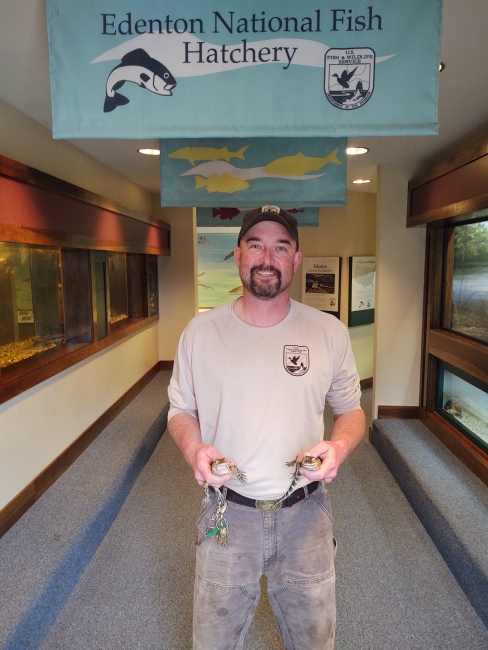 Edenton National Fish Hatchery Deputy Manager Sam Pollocks welcomes two American Alligators to their new home. Their exhibit is the one to his left.