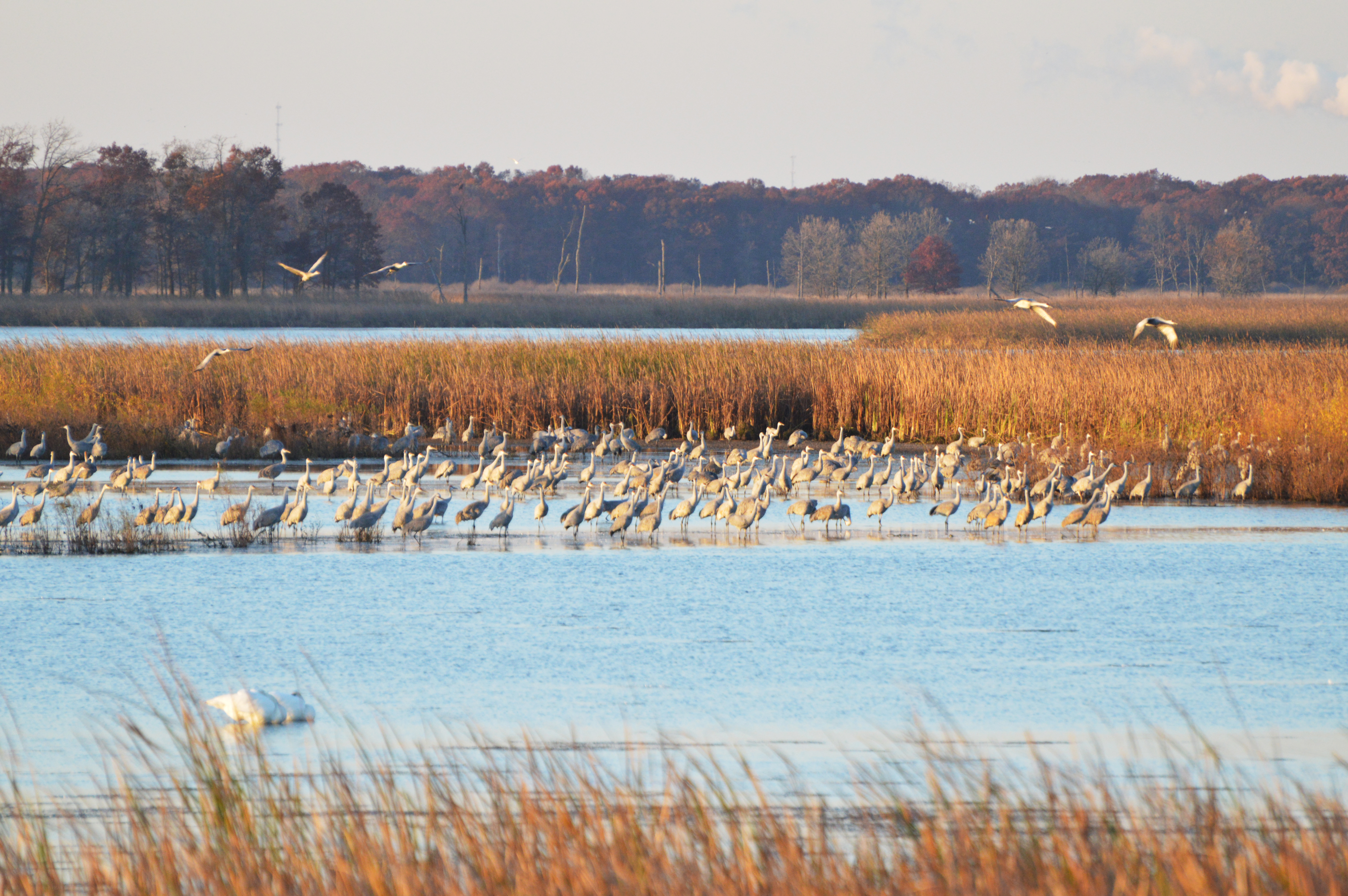 Sandhill cranes gather at a wetland on Sherburne National Wildlife Refuge in Minnesota. The Refuge's wetlands provide habitat for up to 50 pairs of breeding sandhill cranes each year.