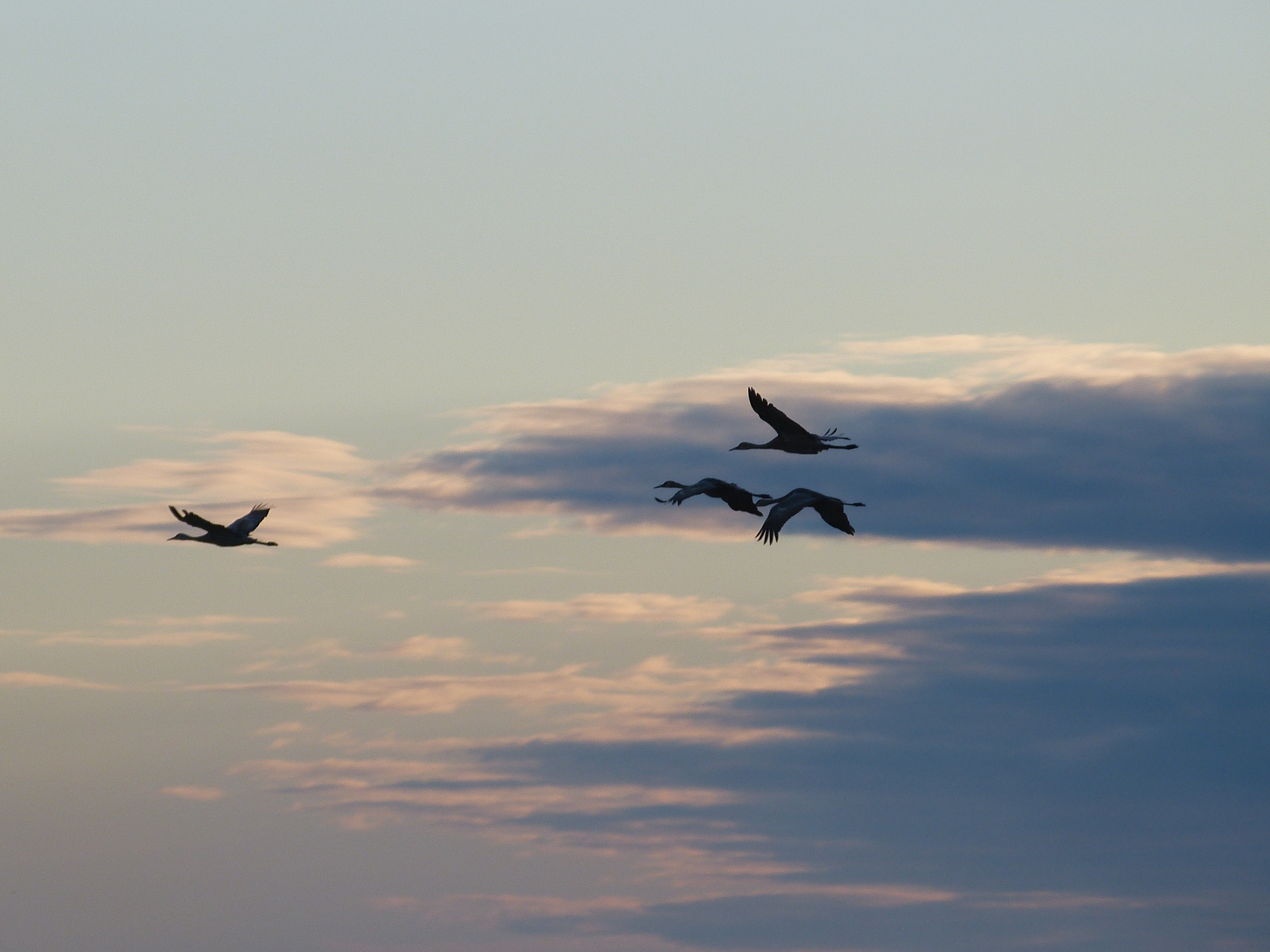 Four sandhill cranes fly over Yukon Delta National Wildlife Refuge in Alaska.