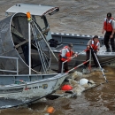 Red Bluff Fish and Wildlife Office staff prepare to install a rotary screw trap at the Red Bluff Diversion Dam on the Sacramento River.