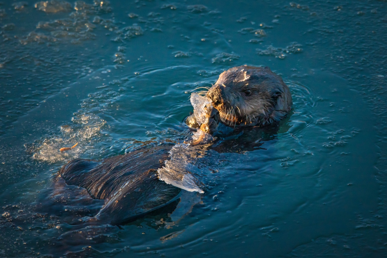 A sea otter holds onto a piece of ice while swimming.