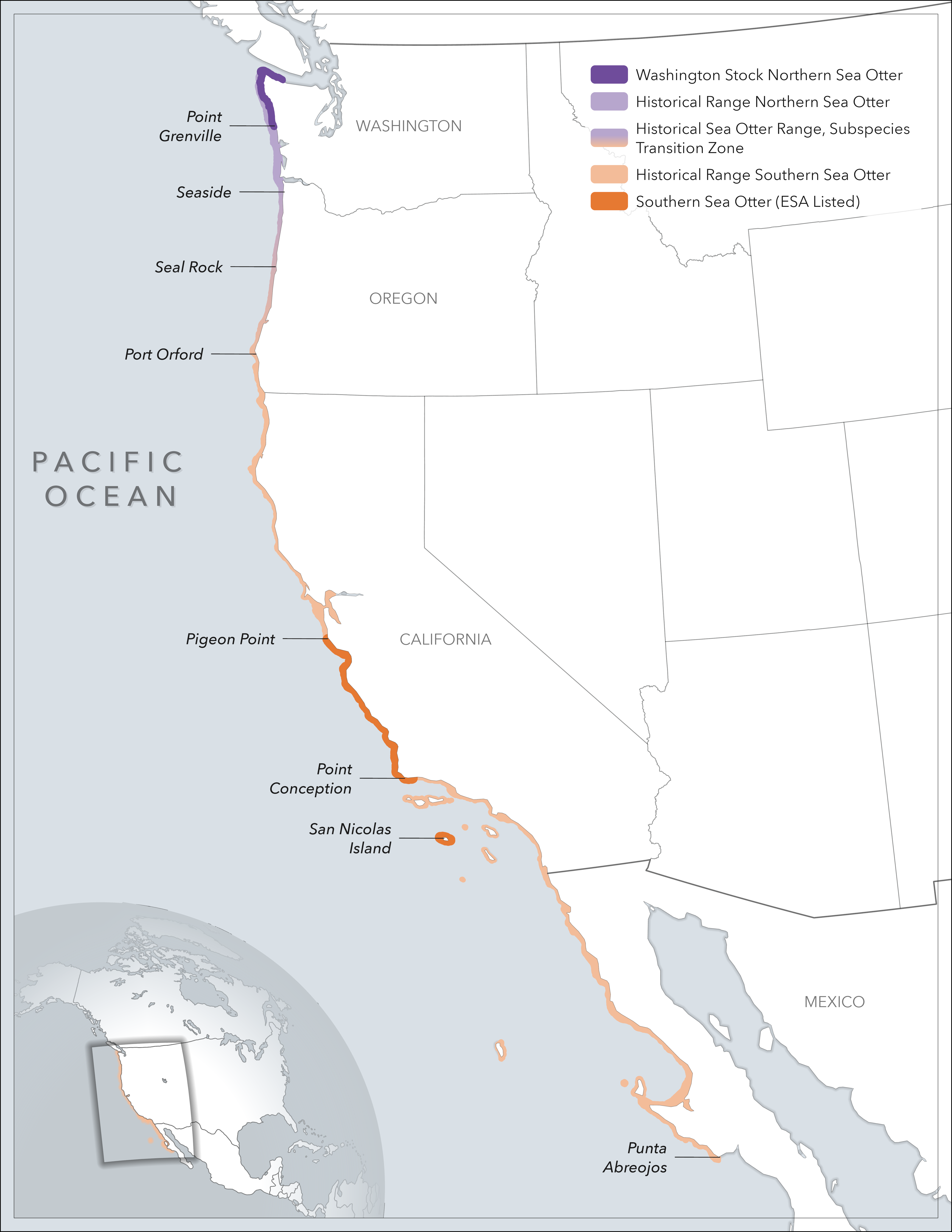 Sea otter distribution along the Pacific Coast. Map by USFWS.