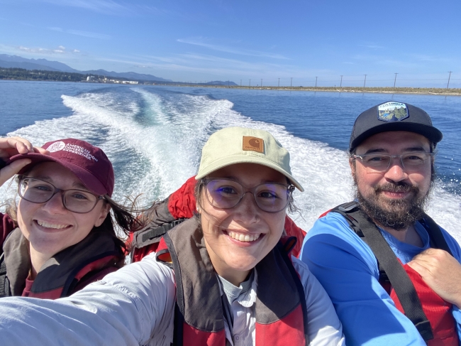 American Conservation Experience AmeriCorps Member Megan Frey smiles with Bureau of Indian Affairs WaterCorps members Maya Bass and Chris Lage during a beach seining survey in Port Angeles, Washington.