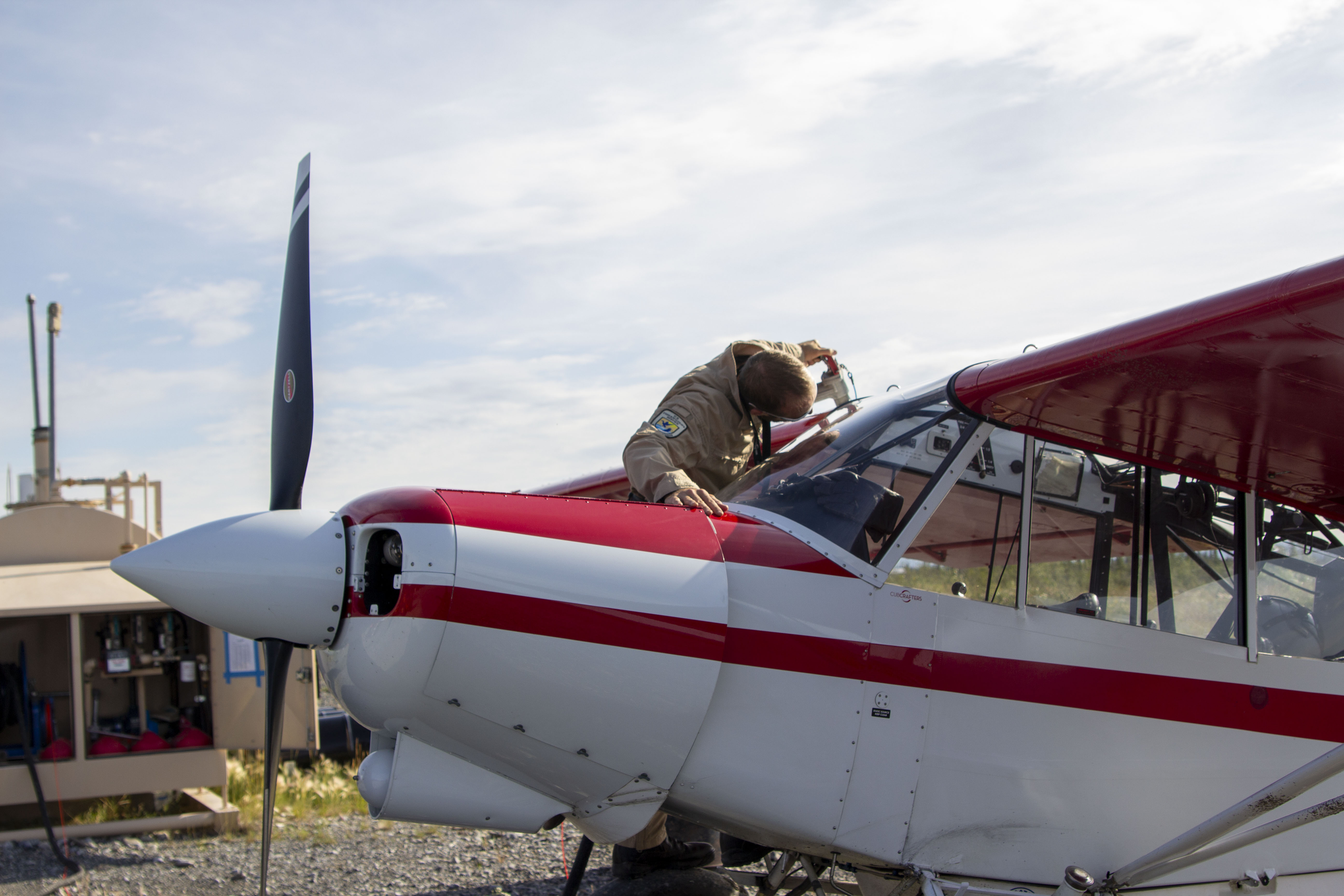 Senior Federal Wildlife Officer/ Airplane Pilot Cody Smith tops off a Top Cub bush plane with AVGAS. Remote fuel stations provide extended range for refuge staff during operations with an aviation component.