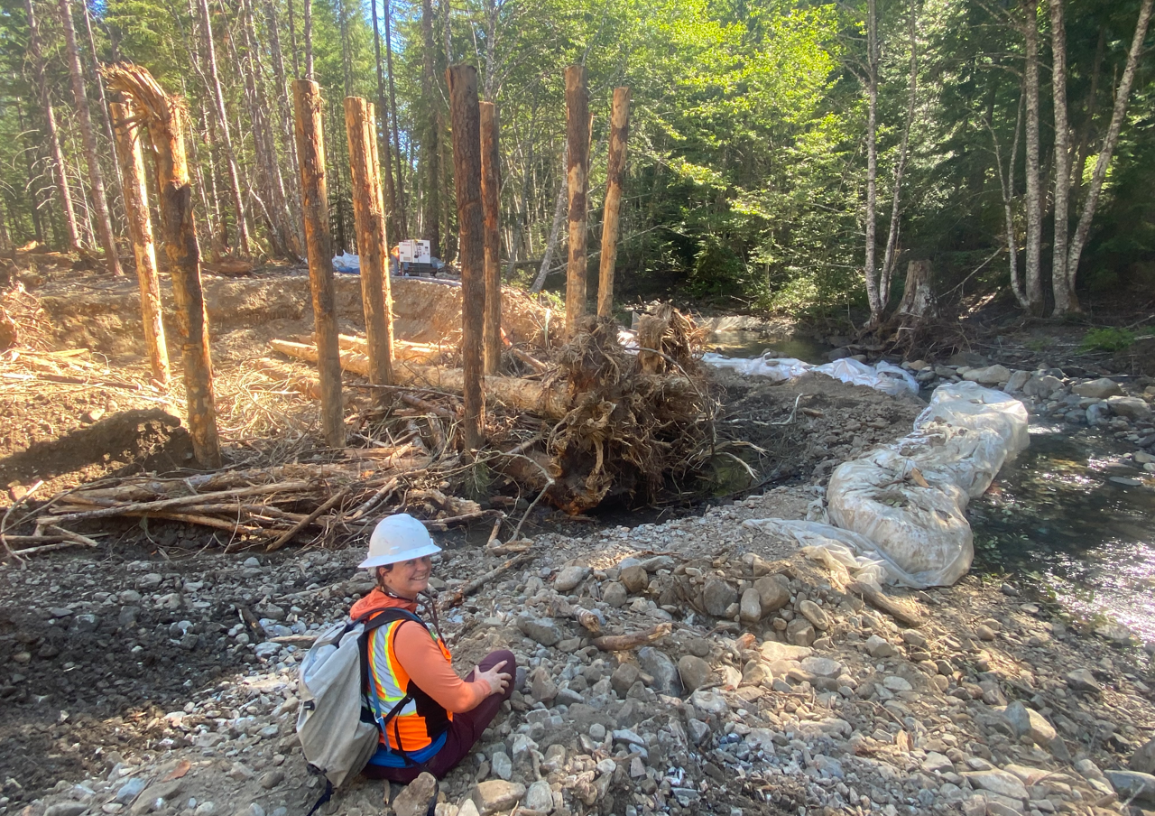Service biologist Katy Pfannenstein at the upstream end of the restoration project during construction. Note the bulk bags deflecting the stream flow to keep water out of the work area. This structure was created to split high flows between the main channel and the high flow side channel, which was also constructed during this project