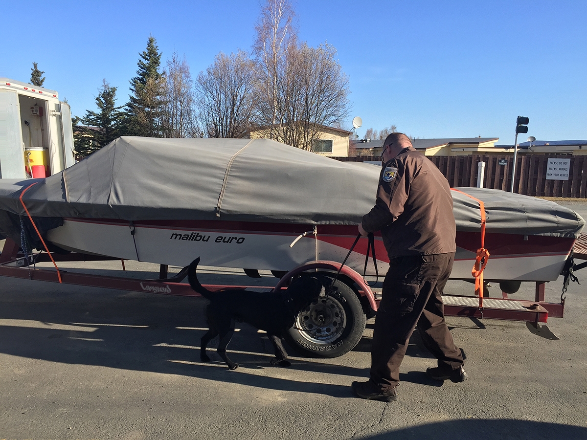 Service's K-9 Unit Dock and his handler inspect a boat for invasives.