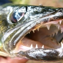 Close-up of the sharp teeth of a walleye held by a staff member of the Grand Junction Fish and Wildlife Conservation Office.