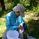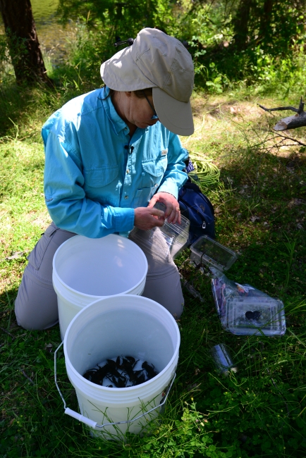 Maria Ellis, from Spring Rivers Ecological Sciences, prepares Shasta crayfish (Pacifastacus fortis) for transport to the restored creek.