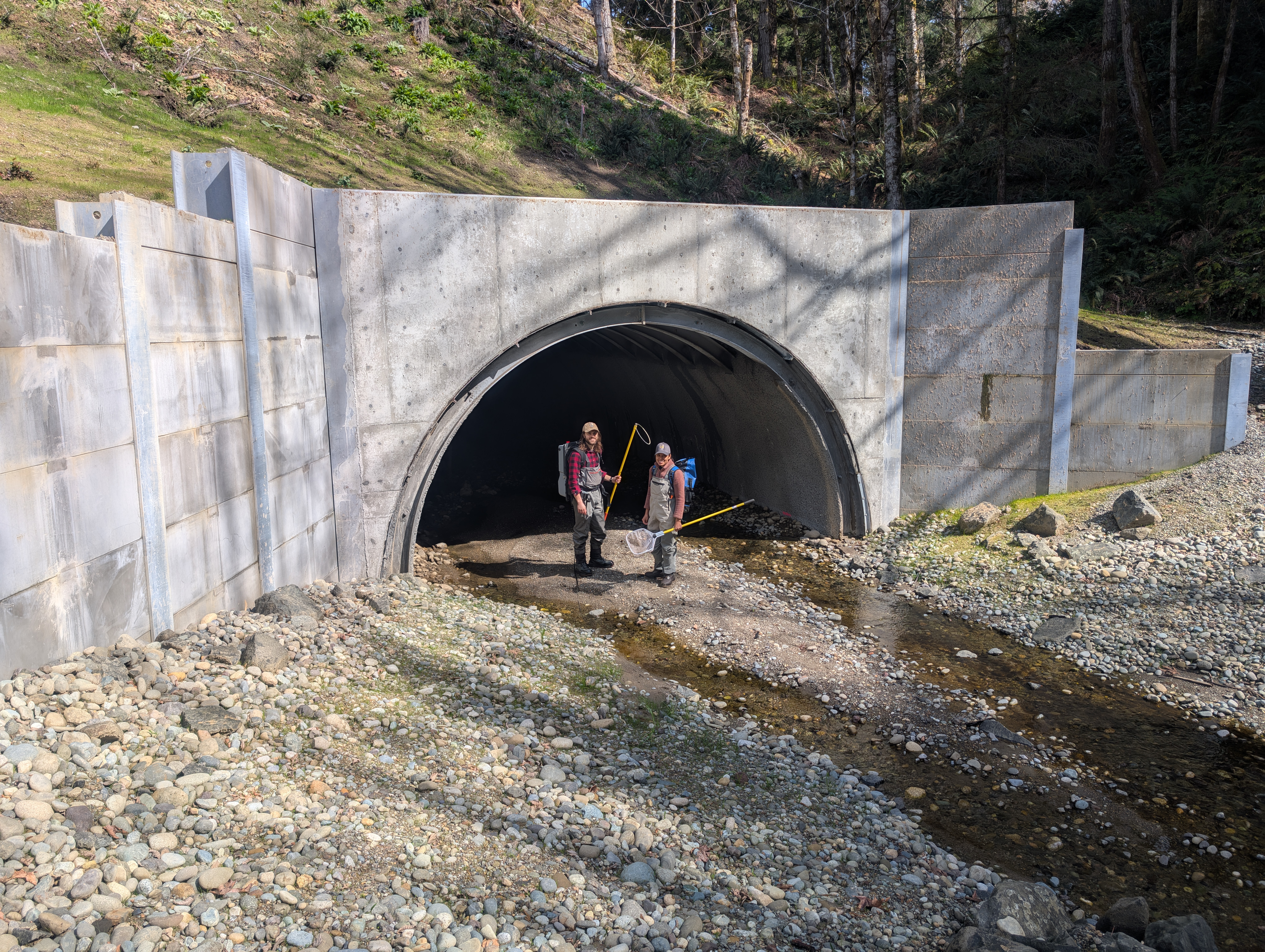 Garret Foster, USFWS Technician, and Charlotte Shaw, USFWS Intern, stand in a newly replaced (2025) railroad fish passage structure.