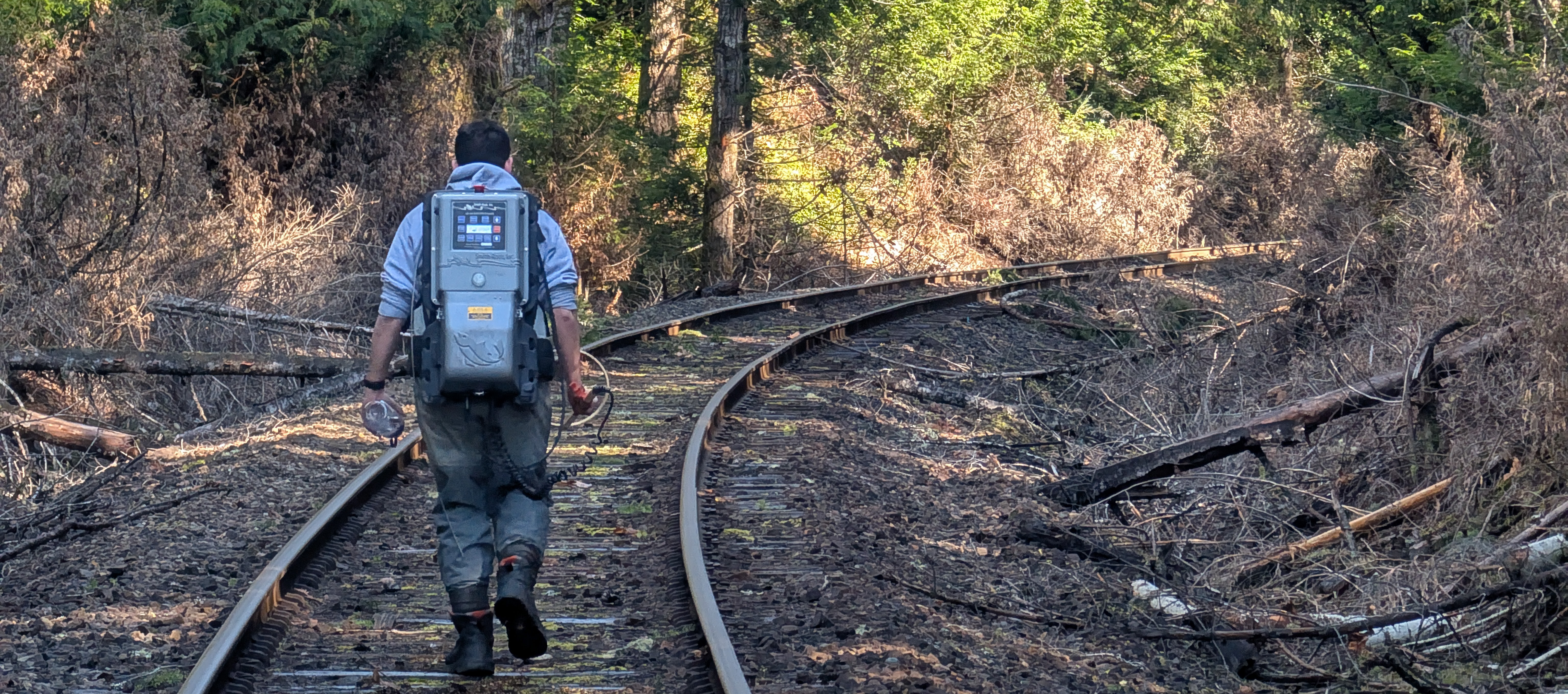 Carlos Olivas, USFWS Intern, walks down the Shelton-Bangor-Bremerton Railroad wearing an electrofishing backpack