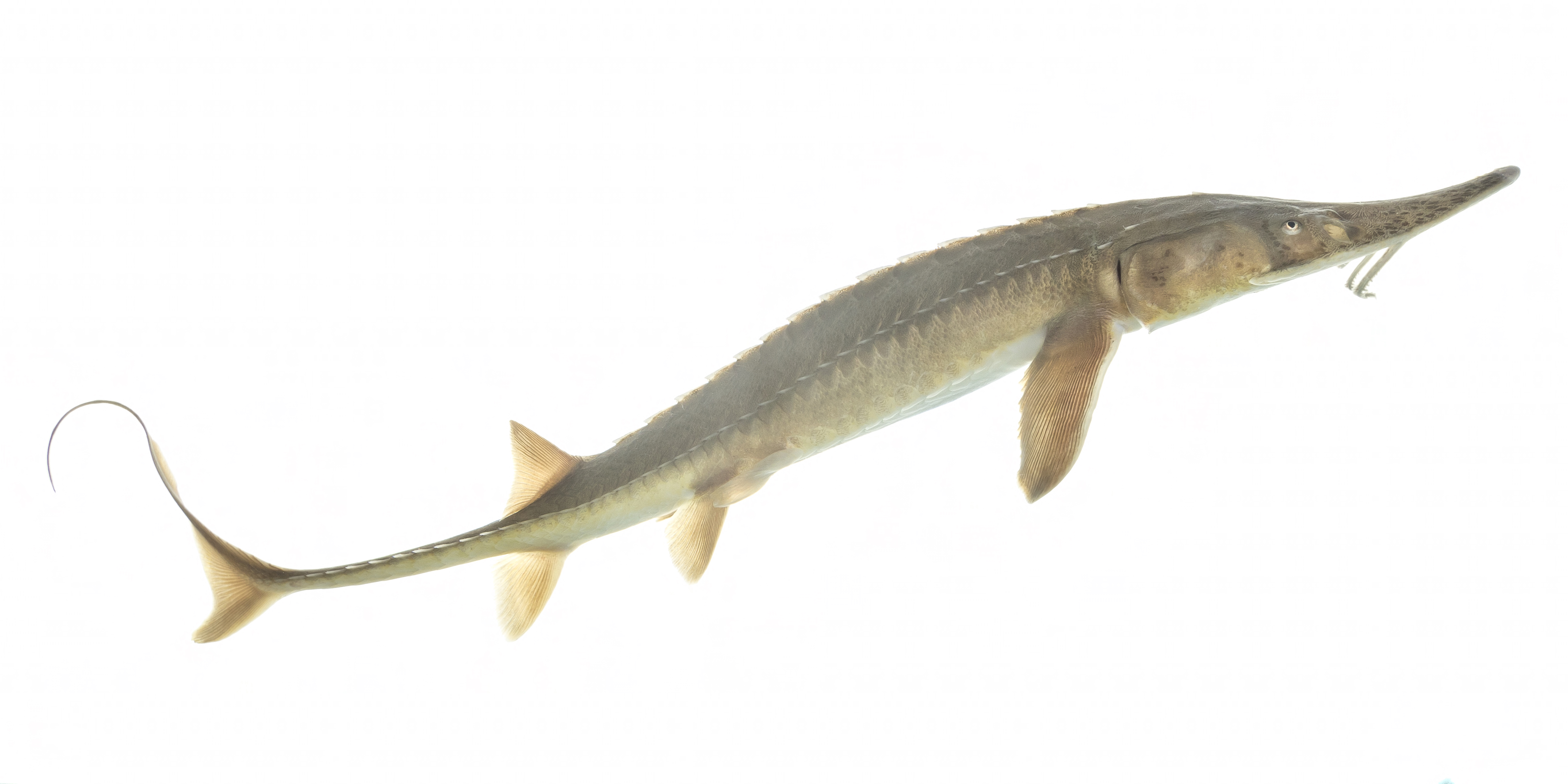 The shovelnose sturgeon is smallest of the ancient sturgeon species in North America and is similar in appearance to pallid sturgeon. It has a flat, shovel shaped snout and has pale, bony plates and large barbels next to its mouth.