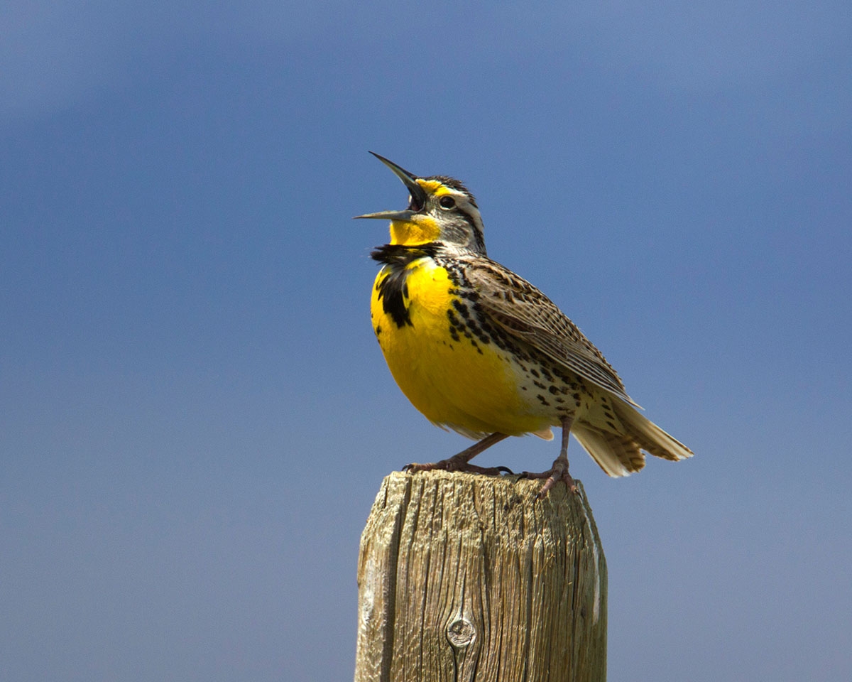 A western meadowlark sings while perched atop a wooden fence post at Red Rock Lakes National Wildlife Refuge. Meadowlarks are a common sight at the Refuge. Their presence adds to the intrinsic value of such a special place. Photo by James "Newt" Perdue/USFWS Volunteer.