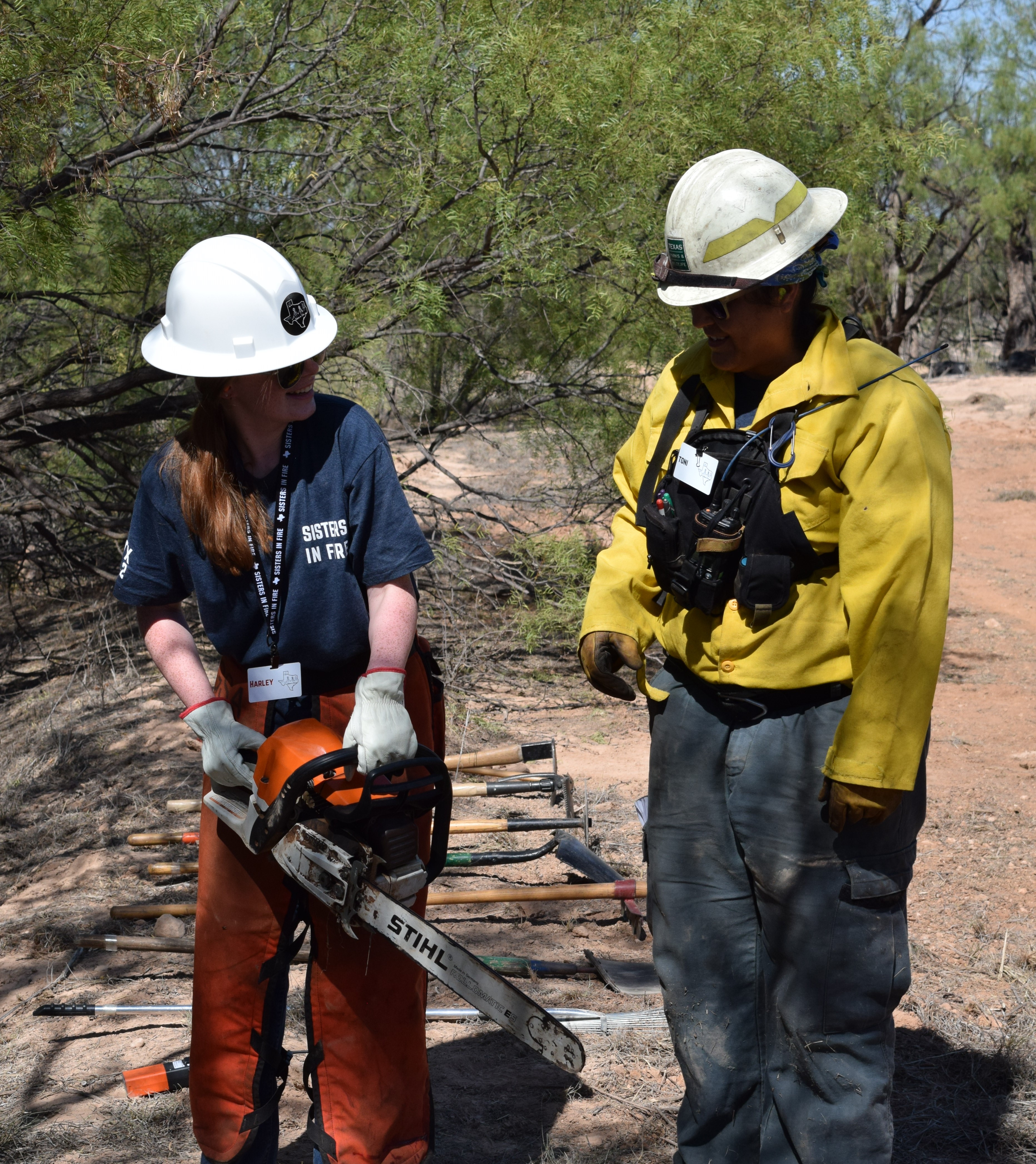 A lead instructor for Sisters in Fire teaches a participant how to use a chainsaw and discusses the uses of a chainsaw during wildland fire operations.