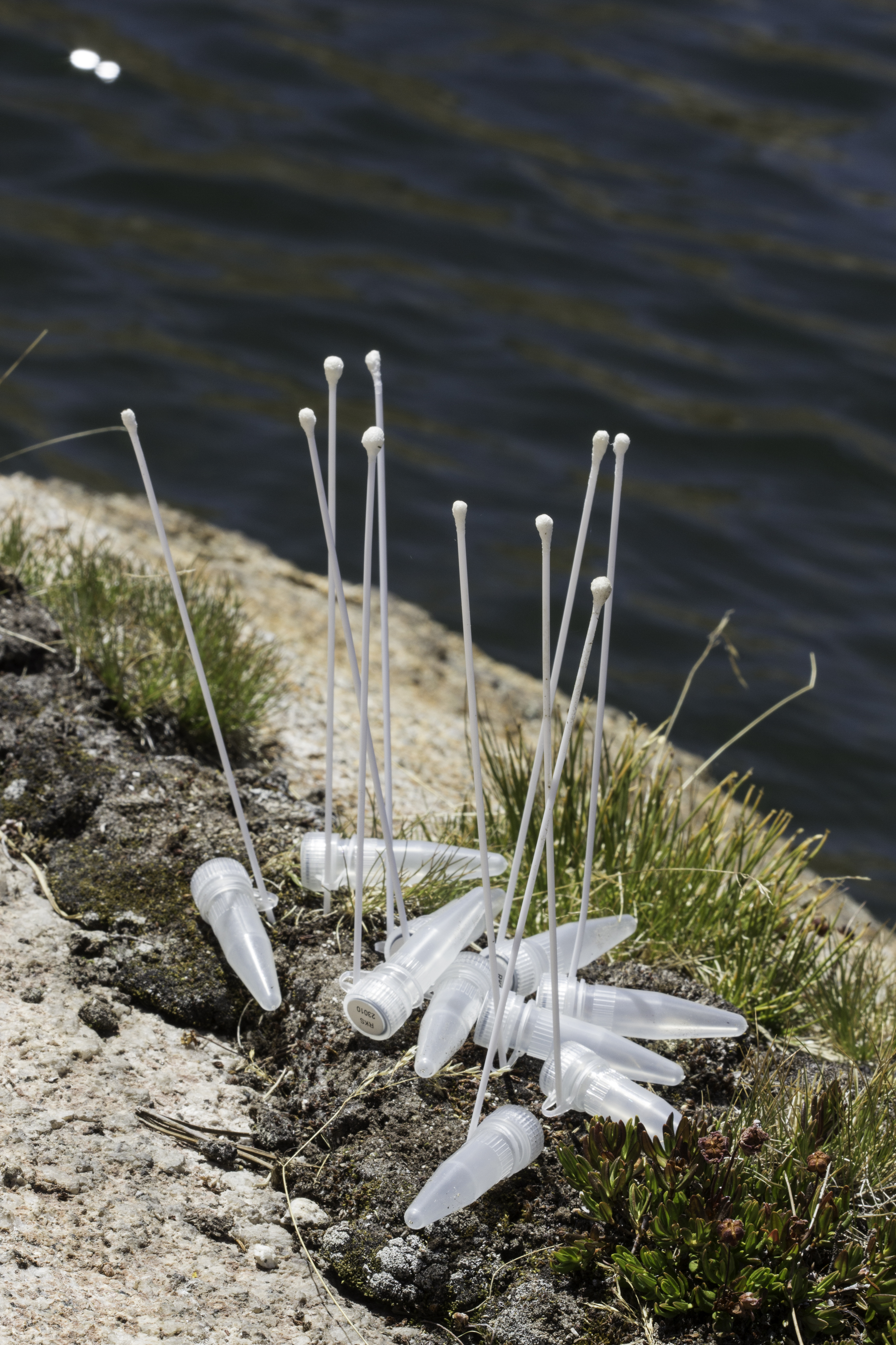 Large swabs like these are used to collect skin samples from the frogs. The samples are taken to labs and analyzed for the presence of Bd. Biologists review the results to determine if an outbreak is underway.
