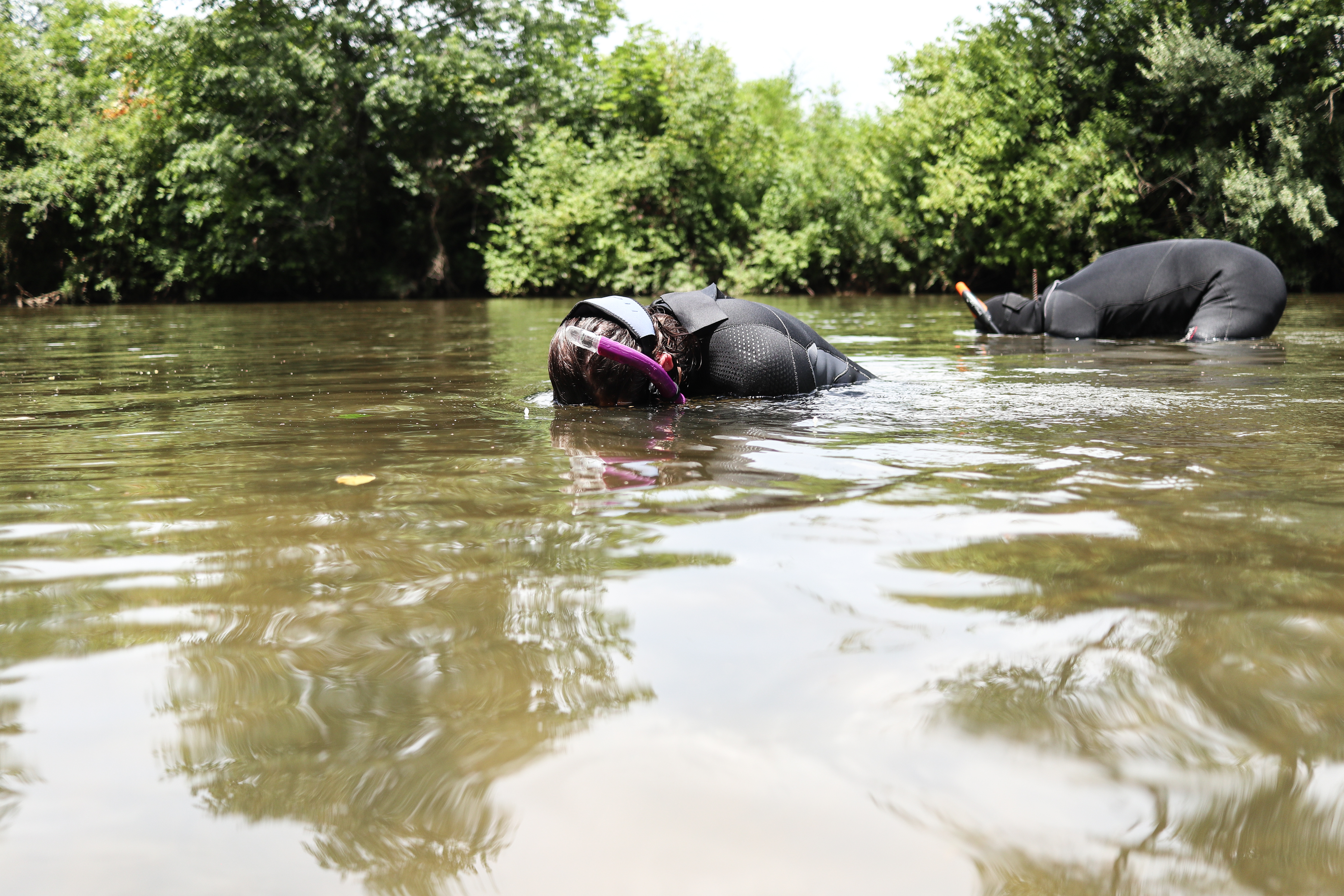 Brittany Barker-Jones and Jay Mays search for mussels in North Carolina's French Broad River.