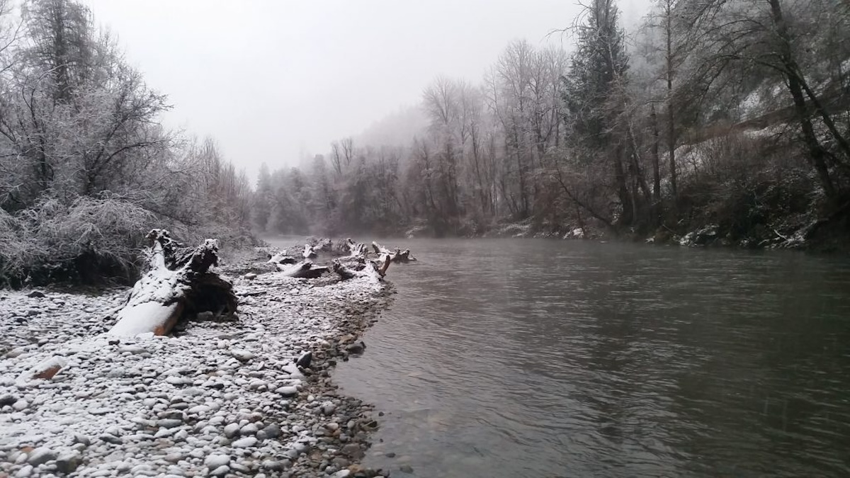 Snowy gravel bar along the bank of the Trinity River