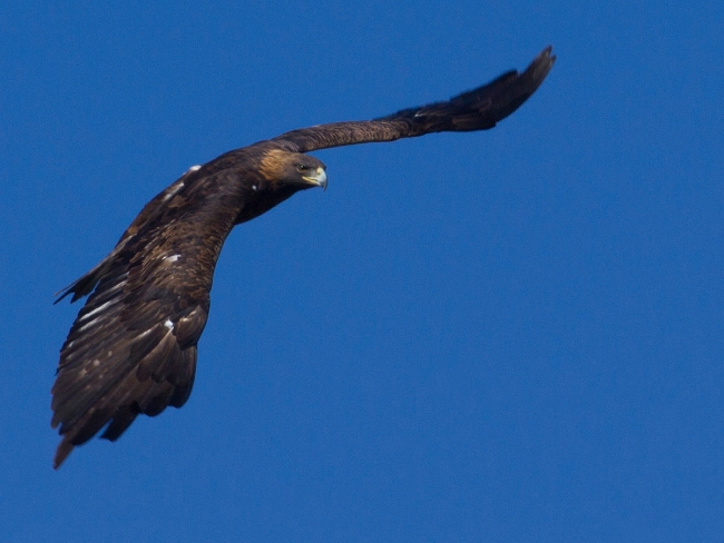 A Golden Eagle soaring in a blue sky above Red Rock Lakes National Wildlife Refuge. Photo by James "Newt" Perdue/USFWS Volunteer.