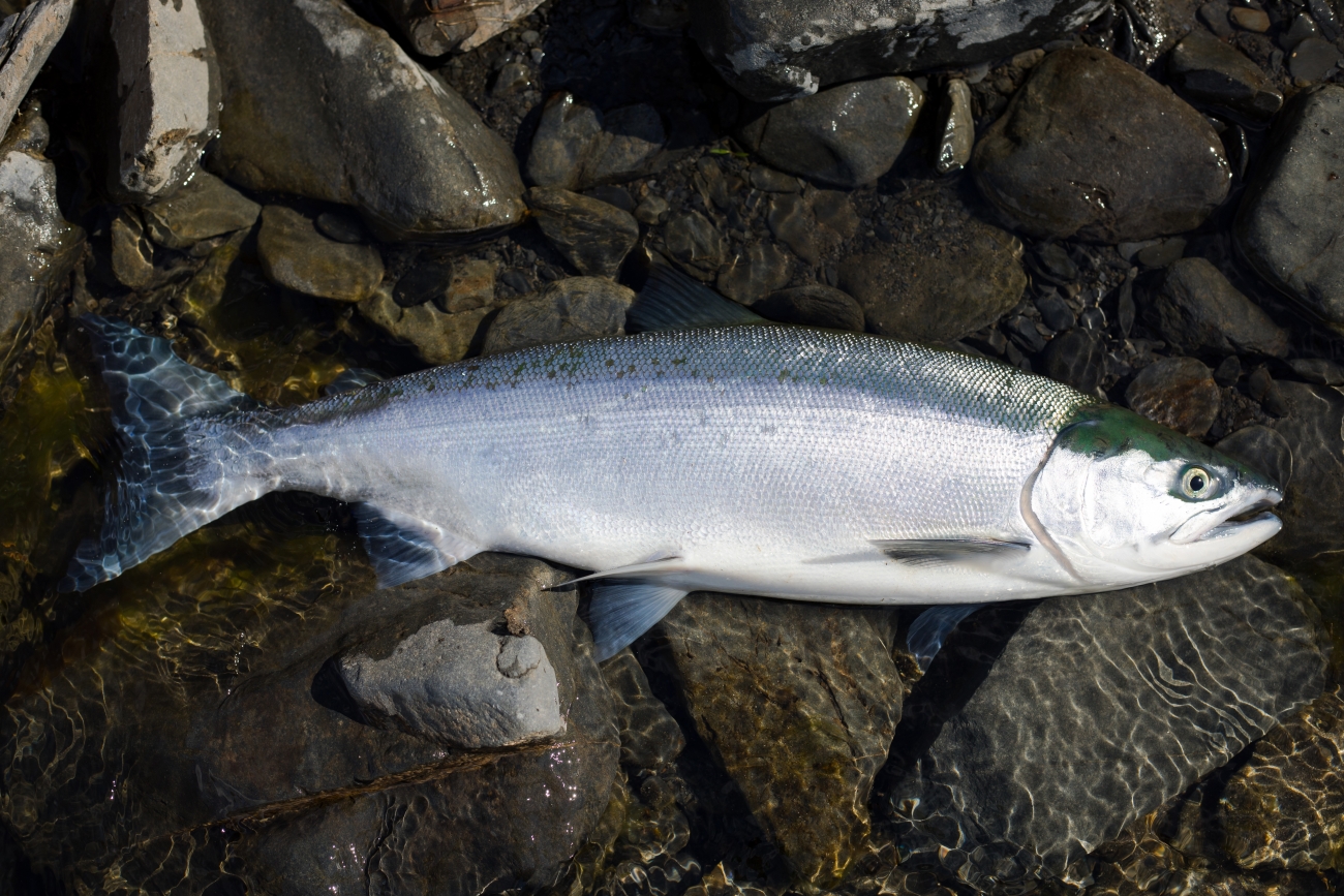 Fresh sockeye salmon caught on a fly rod.
