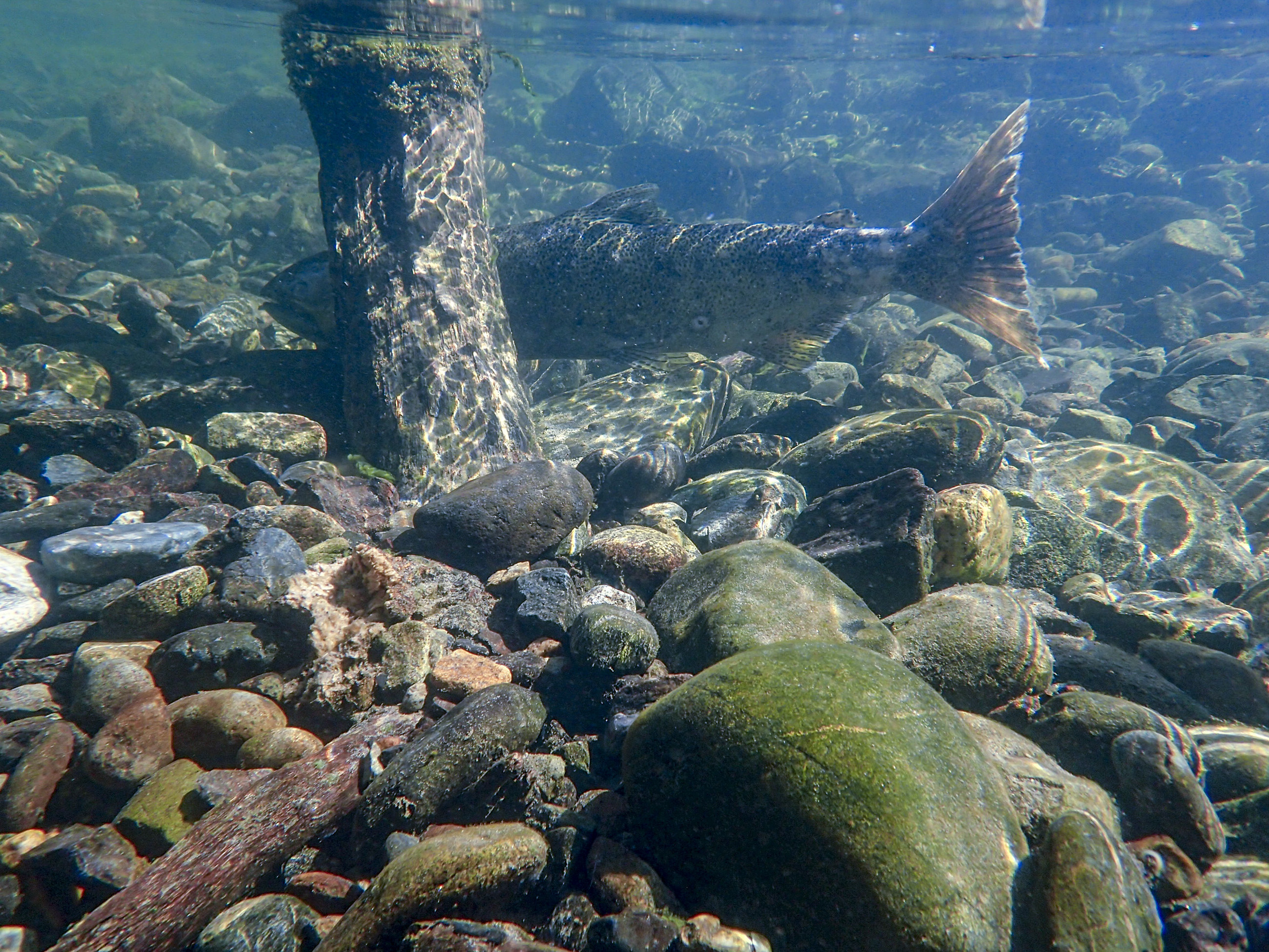 Spring-run Chinook salmon’s (pictured here on the Trinity River) ability to construct nests (or redds) beginning in September (typically earlier than fall-run Chinook salmon), leads to the river bed being rearranged and an altering of the shape of the river bottom, thus improving the habitats for other fish and bugs. Credit: John Heil/USFWS