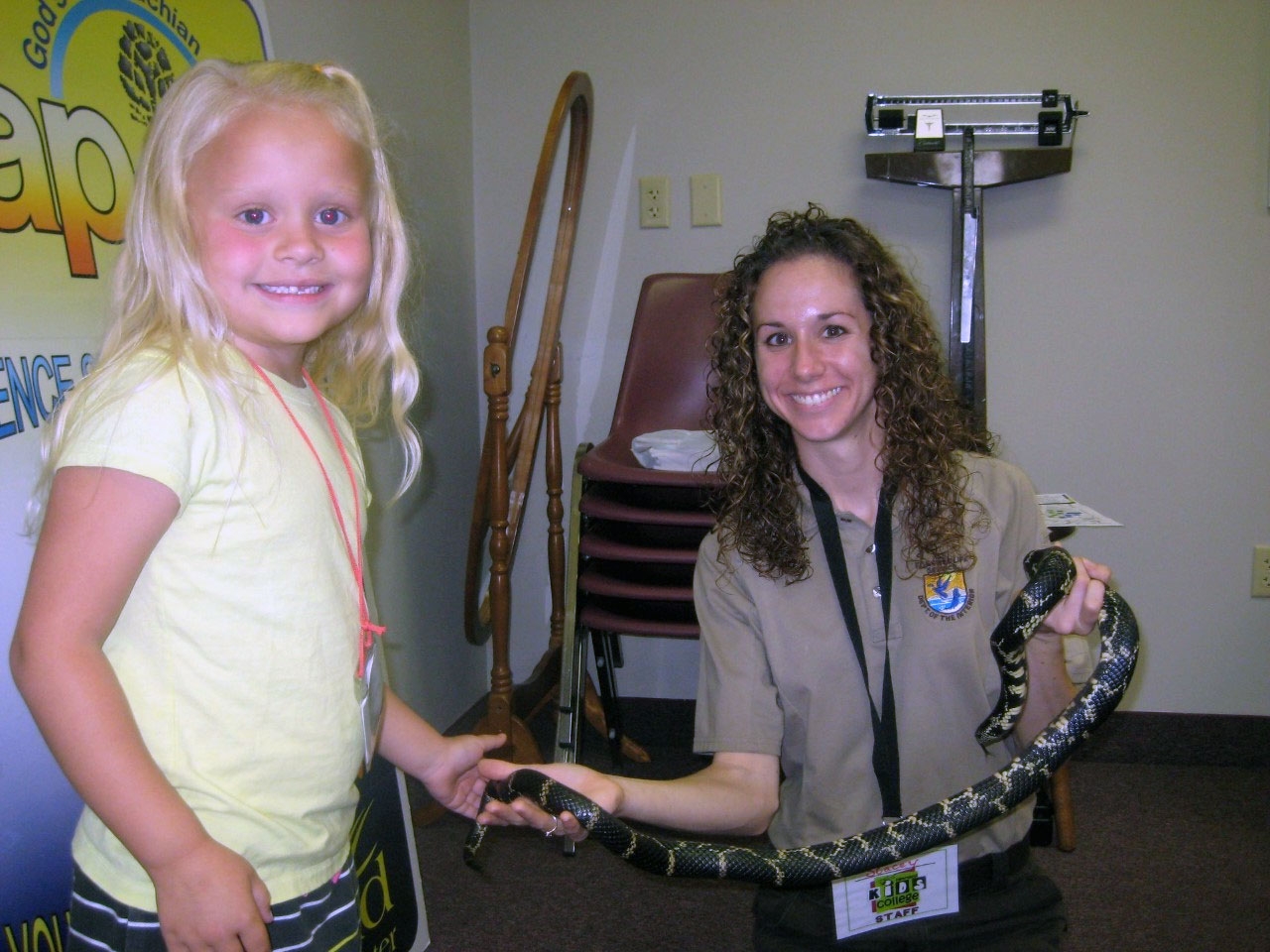 Educational specialist Stacey Hayden with a scaled ambassador, King Tut, an eastern king snake. Visiting schools is just one of a stack of duties that Hayden handles for Clarks River and Green River National Wildlife Refuges in Kentucky.