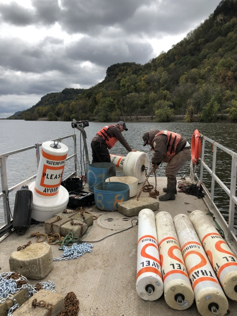 Refuges staff attach an anchor to the base of a Voluntary Waterfowl Avoidance Area which will be deployed in the La Crosse District of the Upper Mississippi River National Wildlife and Fish Refuge. Boaters are asked to avoid the area within the buoys for about a month from mid-October to mid-November to give waterfowl a safe space to rest and refuel during the fall migration.
