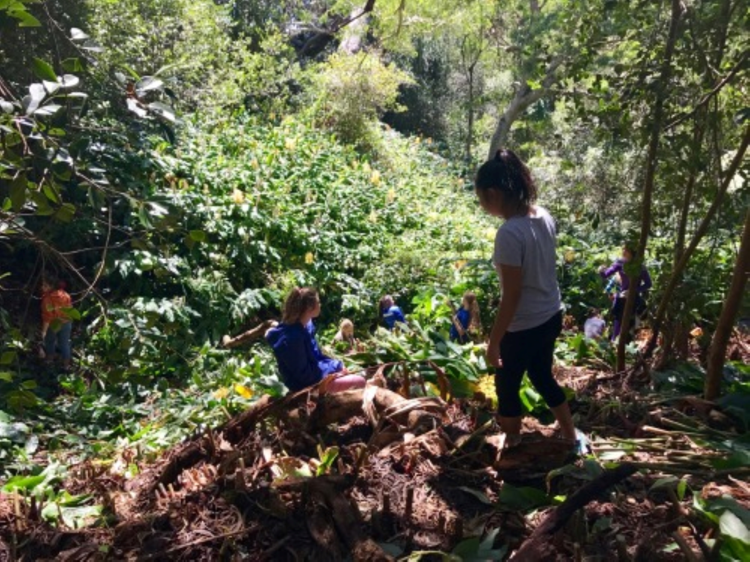 Student and volunteers hike along a trail at Kōkeʻe Park in northwestern Kauaʻi in the Hawaiian Islands,