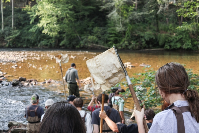 Students in Haywood County, N.C. file into the Pigeon River as part of the 2023 Kids in the Creek educational event.