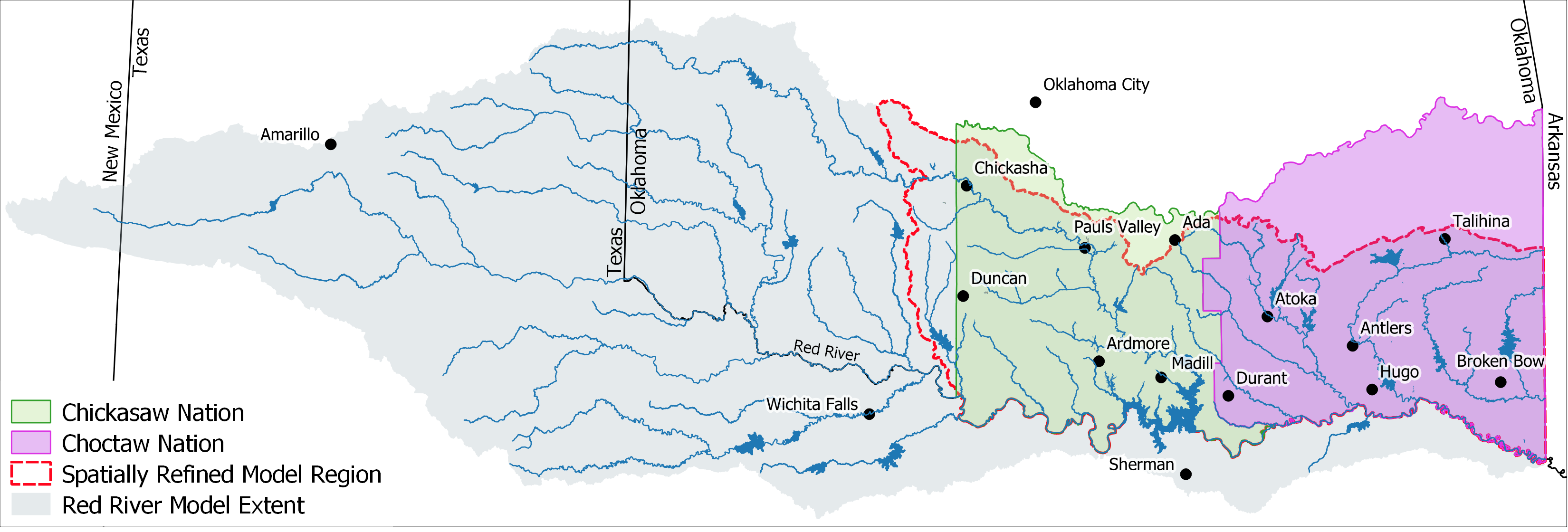 The area of study includes the lands of the Chickasaw Nation and Choctaw Nation of Oklahoma that overlap the Red River Basin.