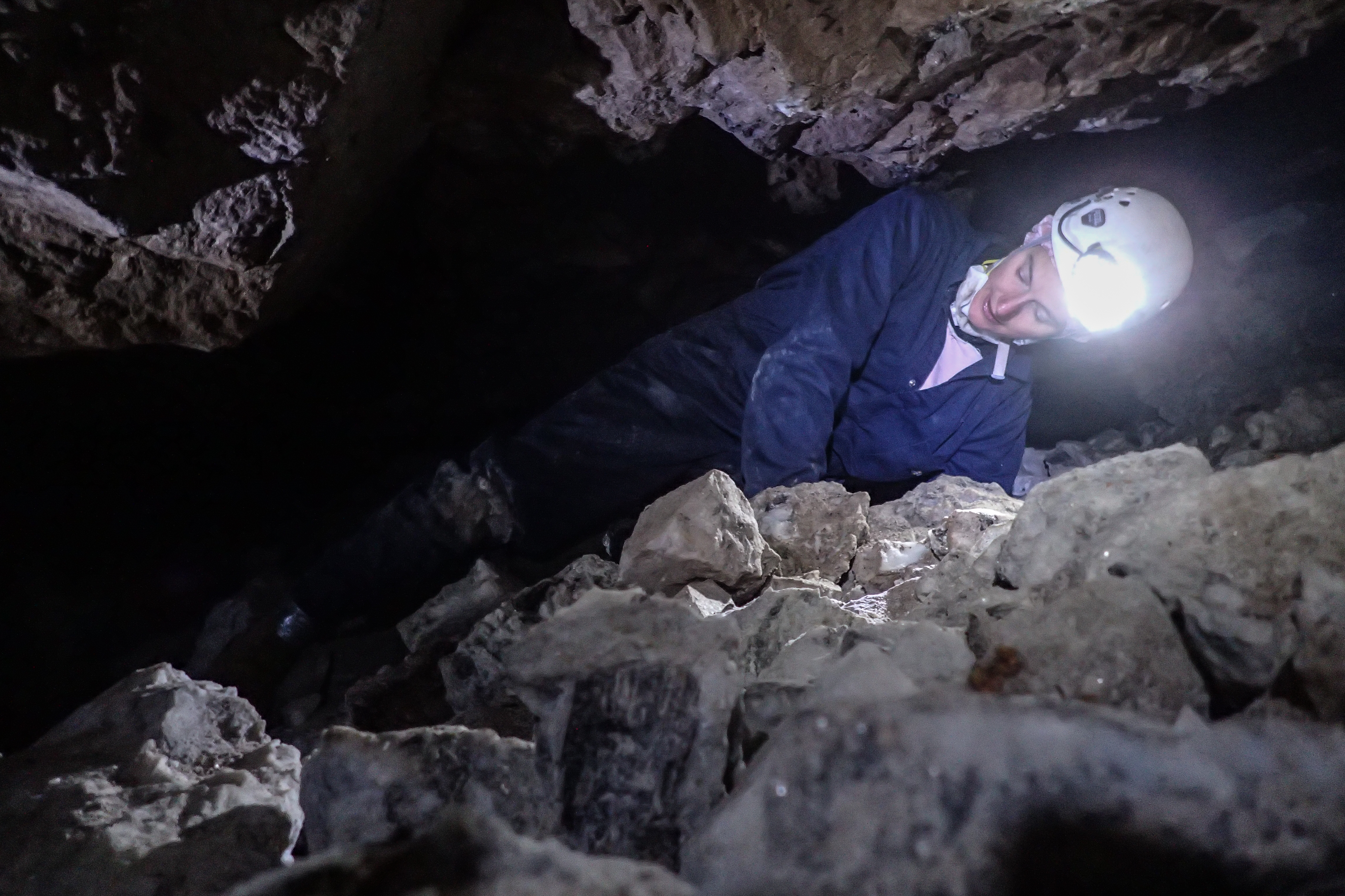 Sue Cameron makes her way through a narrow passage in an abandoned mine