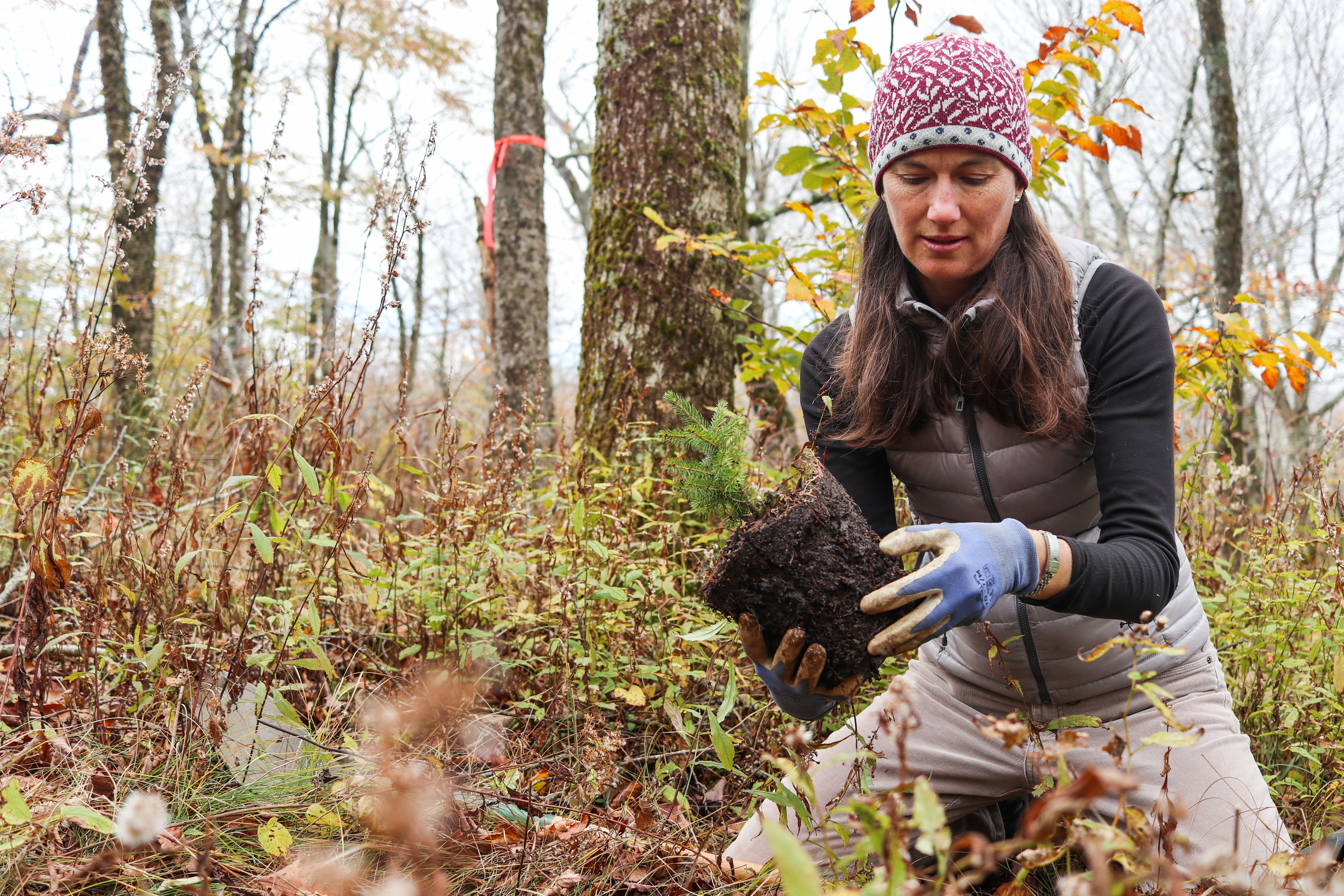Sue Cameron plants a red spruce on Cherokee National Forest
