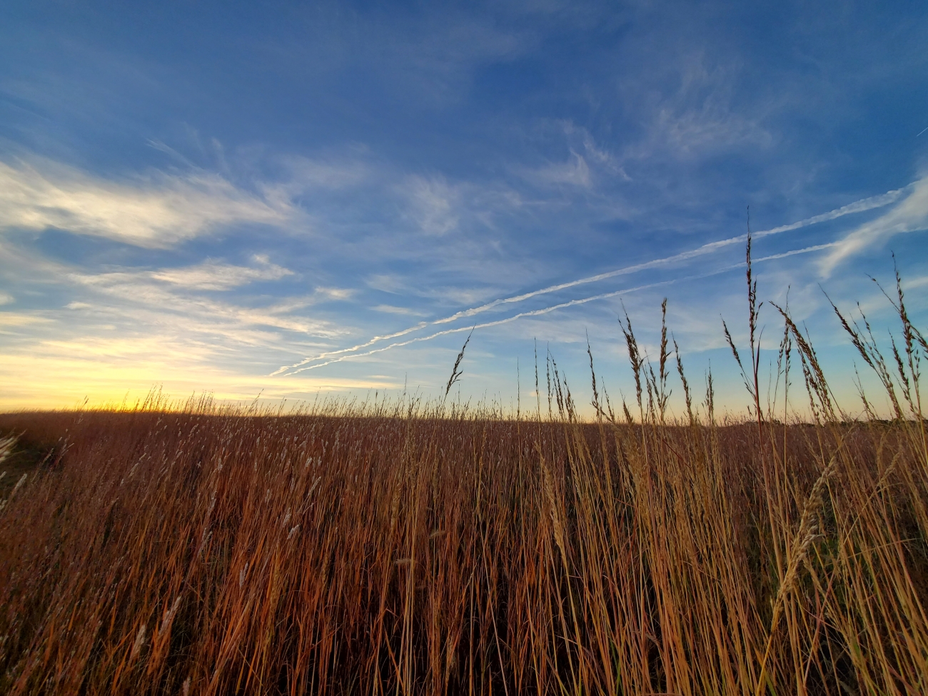 The sun rises over prairie grasses, including yellow indiangrass and little bluestem, at Washita National Wildlife Refuge in Oklahoma.