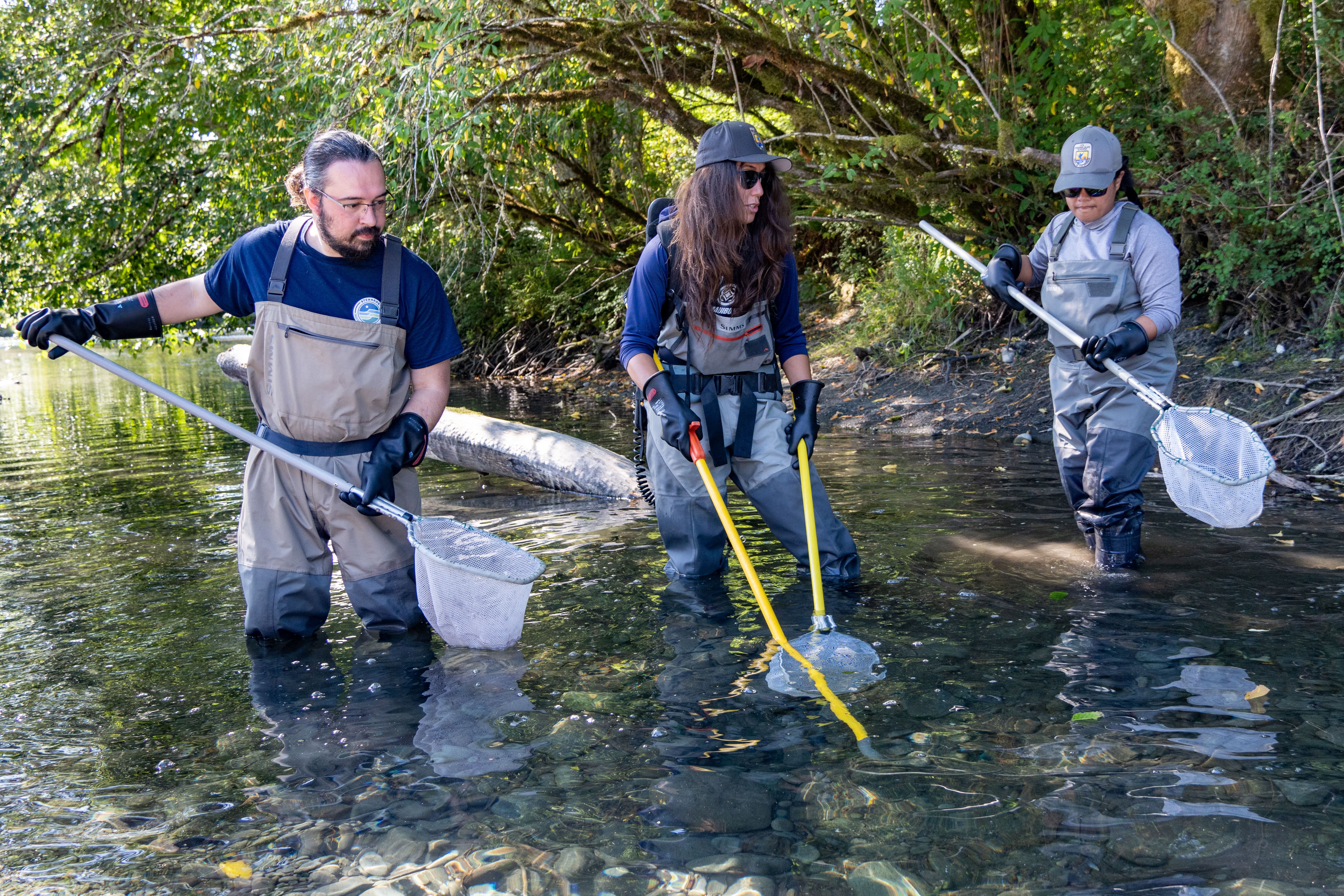 Bureau of Indian Affairs intern Chris Lage and Pathways employee Angel Velasquez stand ready with nets as USFWS employee Keala Pelekai operates the Electrofishing gear in the Dosewallips River.