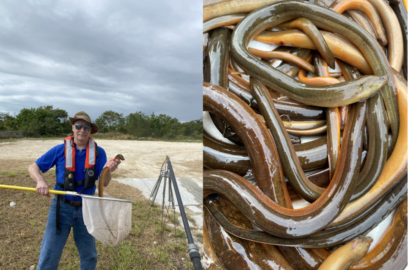 Display of Fish and Aquatic Conservation Deputy Assistant Regional Director Stephen Jackson holding a non-native swamp eel (Monopterus albus) next to a picture of swamp eels collected during the Fall 2022 Fish Slam Miami, FL