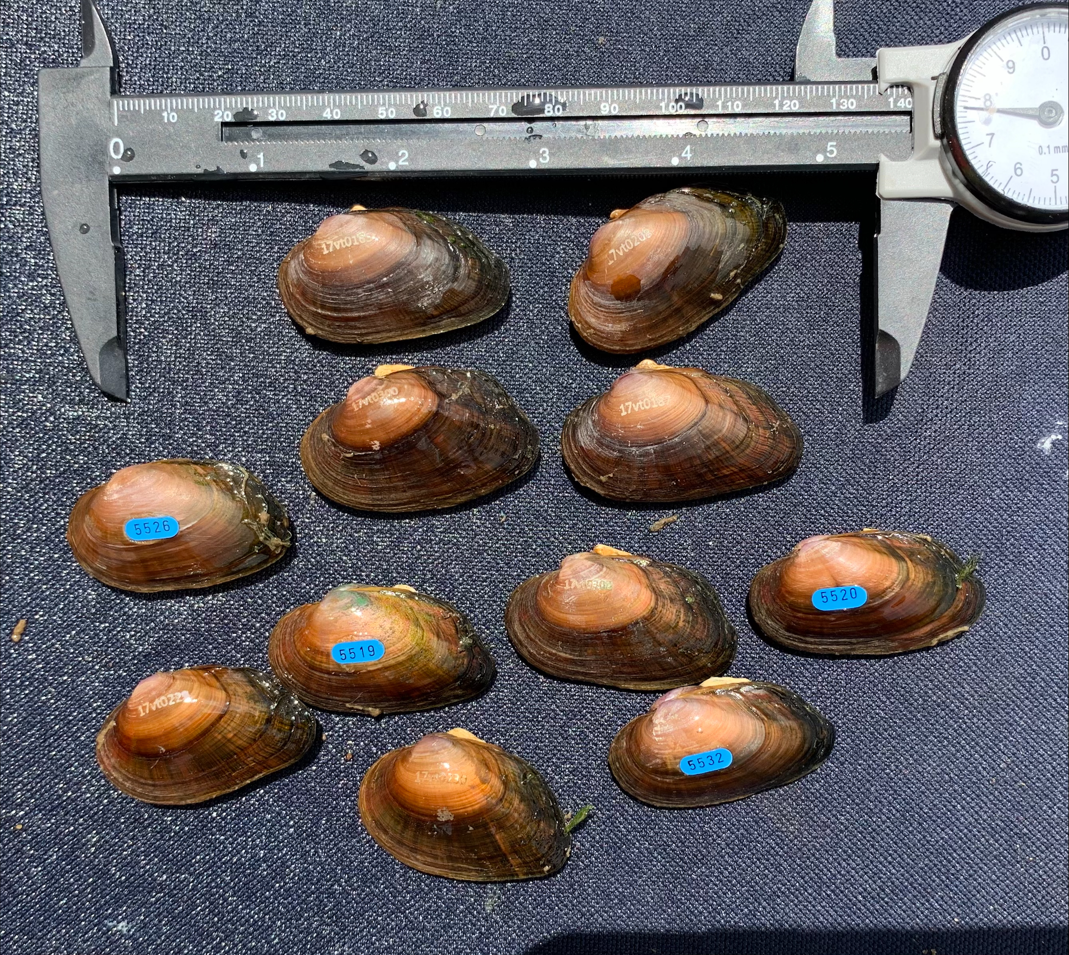 Once biologists rediscovered these tagged purple bean mussels, they measured them to determine their growth. Length is one of the metrics used in mussel health assessments.