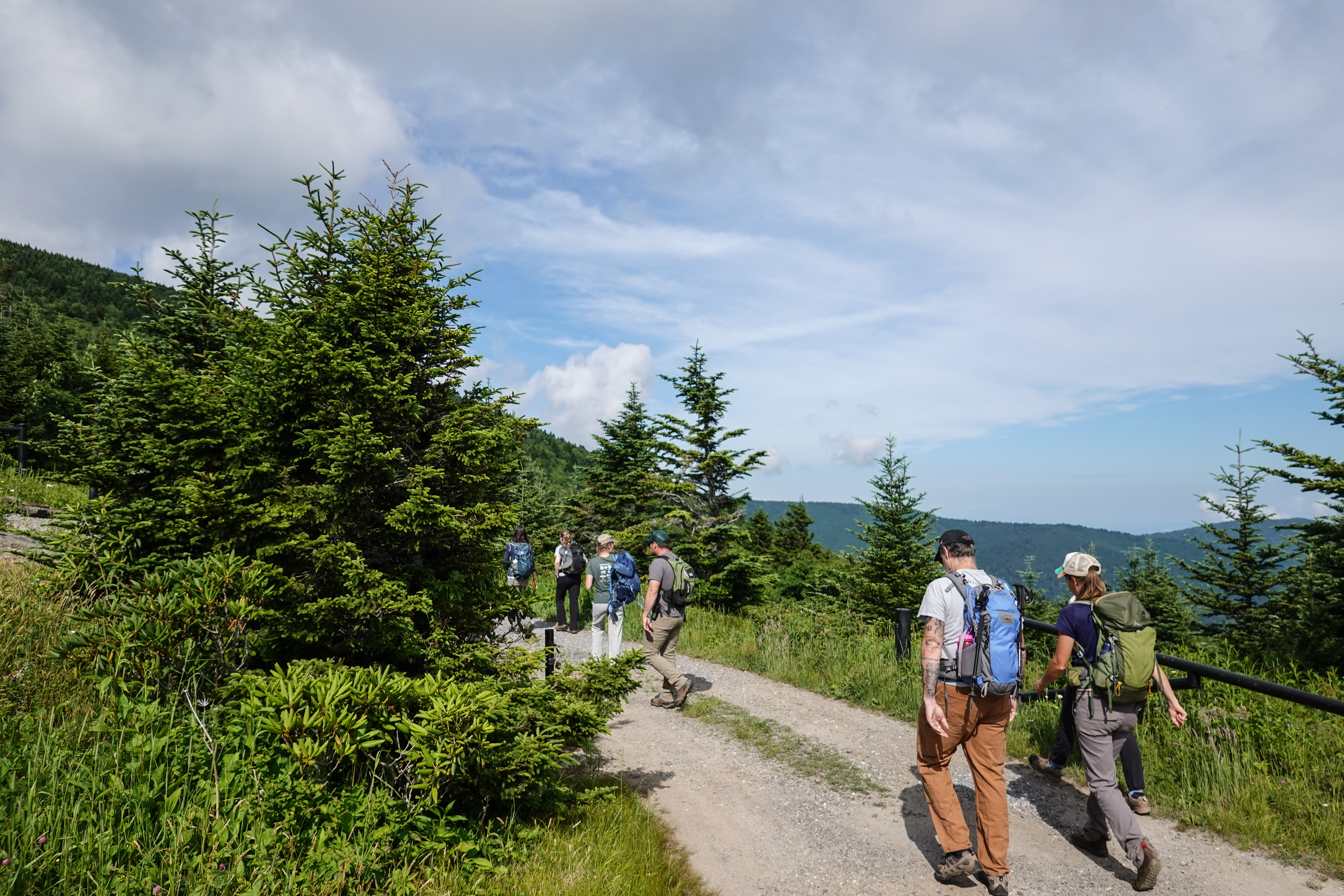 A team of federal, state, and private natural resource experts heads into the backcountry of North Carolina's Black Mountains to examine a potential red spruce restoration site and discuss restoration strategy.
