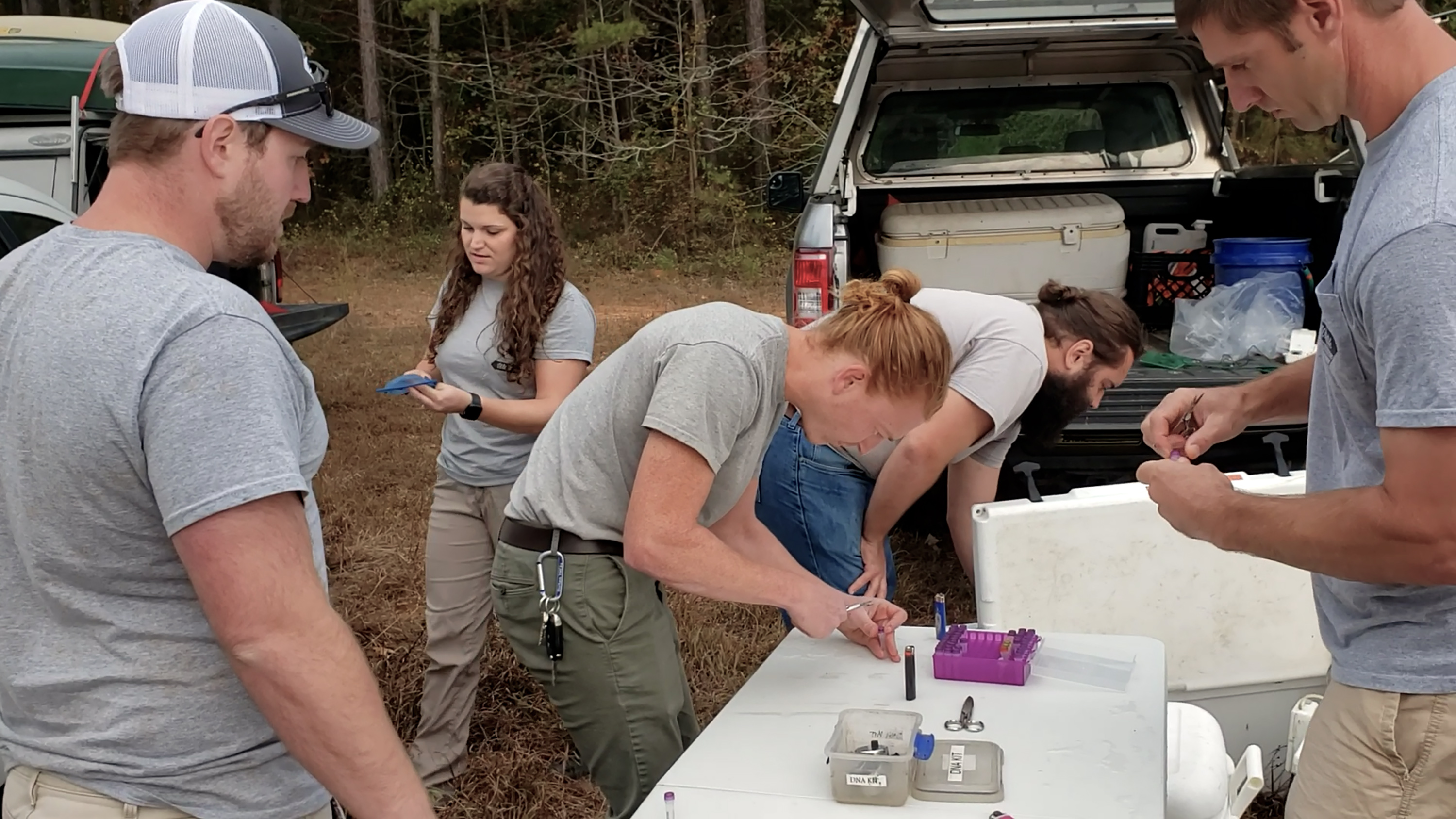 NCWRC's Eastern Region Aquatic Wildlife Diversity team collecting fin samples from Carolina madtom fish before releasing the fish into the wild. Photo by Lilibeth Serrano, USFWS
