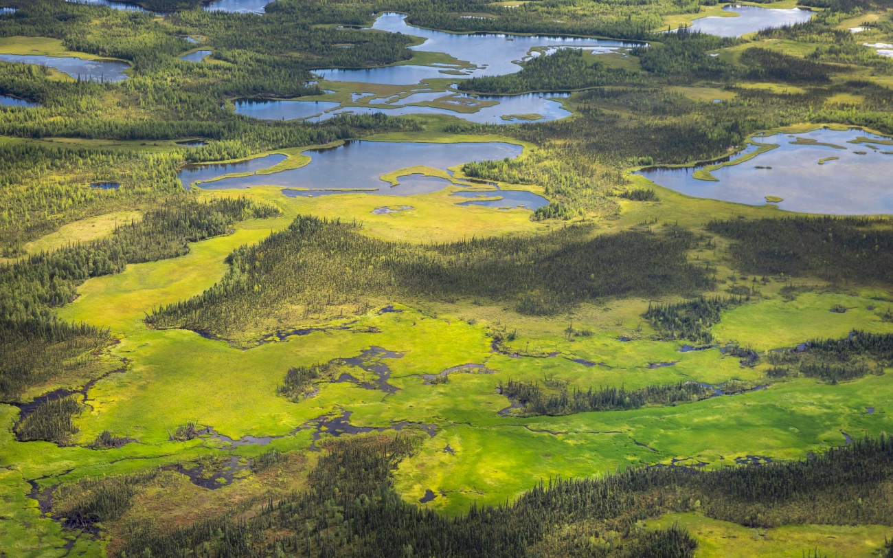 An aerial view of wetlands and boreal forest at Tetlin National Wildlife Refuge.