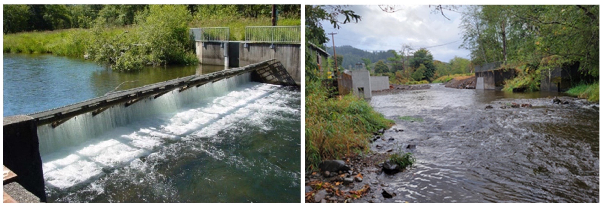 Before and after: The photo on the left shows pre-project channel spanning weir that impeded access to over 14 miles of upstream habitat. The photo on the right shows the restored structure that will provide unimpeded access to wild fish.