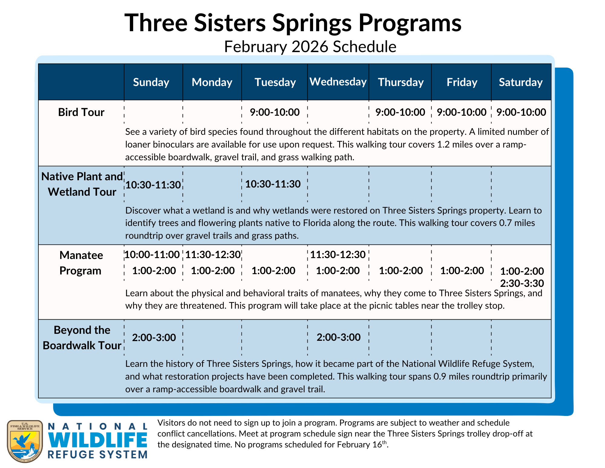 Three Sisters Springs Program Schedule February 2026