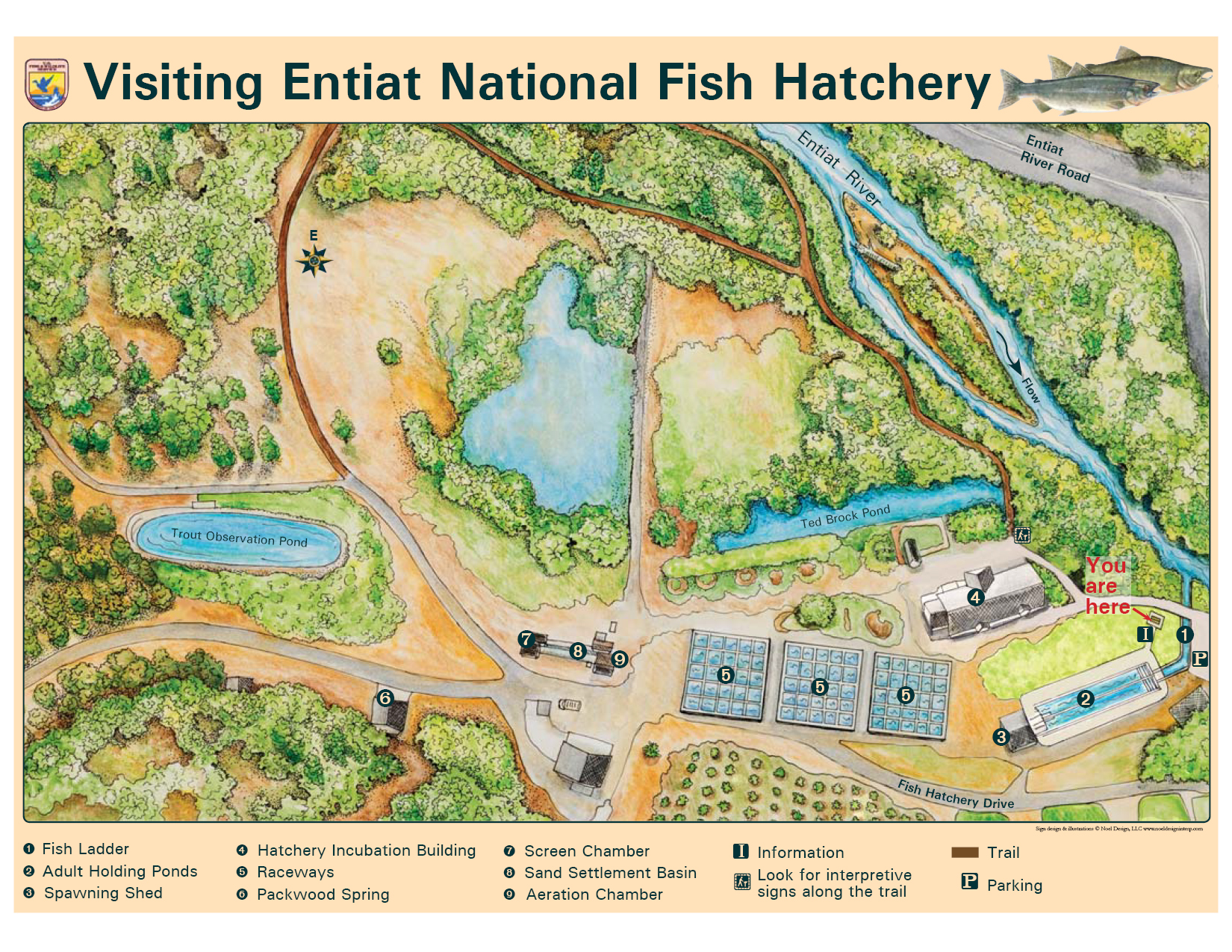 This illustrated map of the hatchery, painted by Sandra Noel, is featured on the self-guided tour flyer.