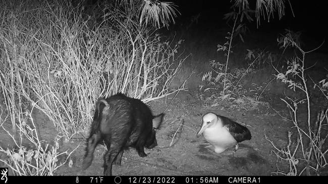 A pig approaches an Laysan albatross nest at Kīlauea Point National Wildlife Refuge on Dec. 23, 2022. The image was captured by a trail camera on the Nīhoku area of the refuge. Over 70 Laysan albatross nests were destroyed by pigs within a few days that week.