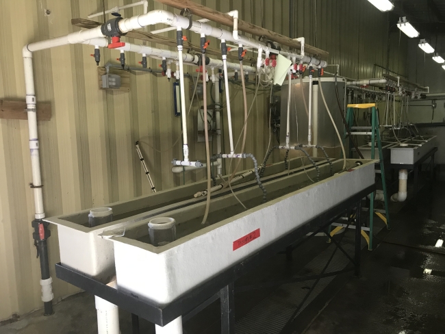 Here are two of the troughs that we use to grow out our larval Lake Sturgeon. When the go into these troughs the weigh approximately 0.15 grams. That is approximately 1/20th of the weight of a standard paper clip. They weigh about 3-4 grams when they are moved to raceways.