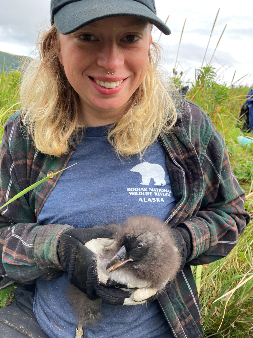 Seasonal volunteer Lily Messinger holding a Tufted Puffin chick.