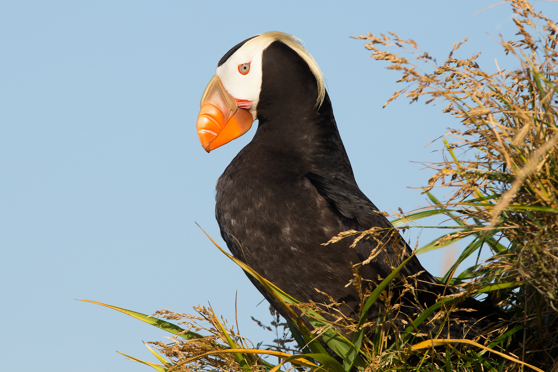 A tufted puffin on an island off the coast of Kodiak Island in Alaska.