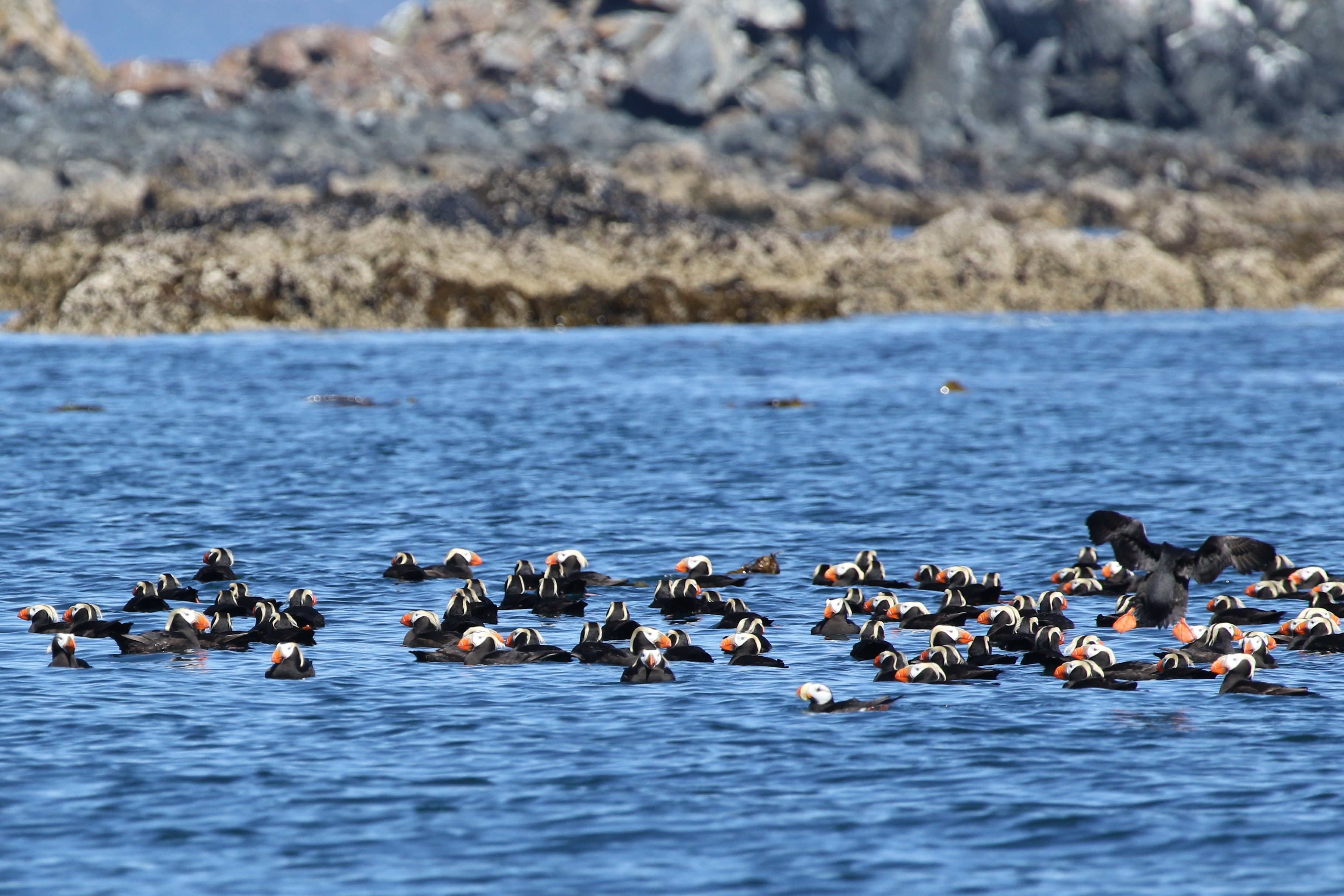 A raft of tufted puffins in the nearshore area of Kodiak Island, Alaska.