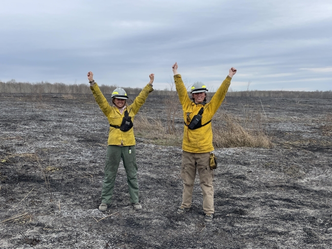 Audrey (left) and a coworker, Fiona, stand in the black celebrating a job well done at Patoka River National Wildlife Refuge in Indiana.