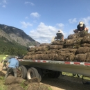 Volunteers and Service staff worked together to unload from a truck bed rolls of matting embedded with live sedge plants.