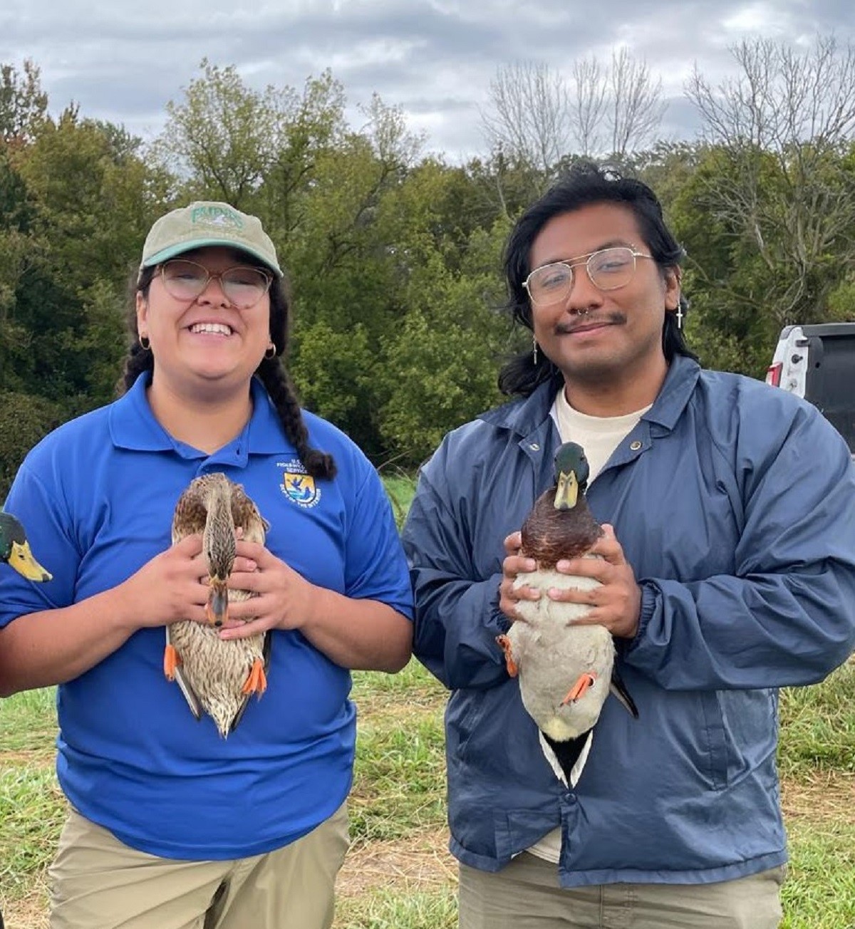 Urban community engagement fellows Jorge Azcona and Cindy Zamarripa release banded mallards